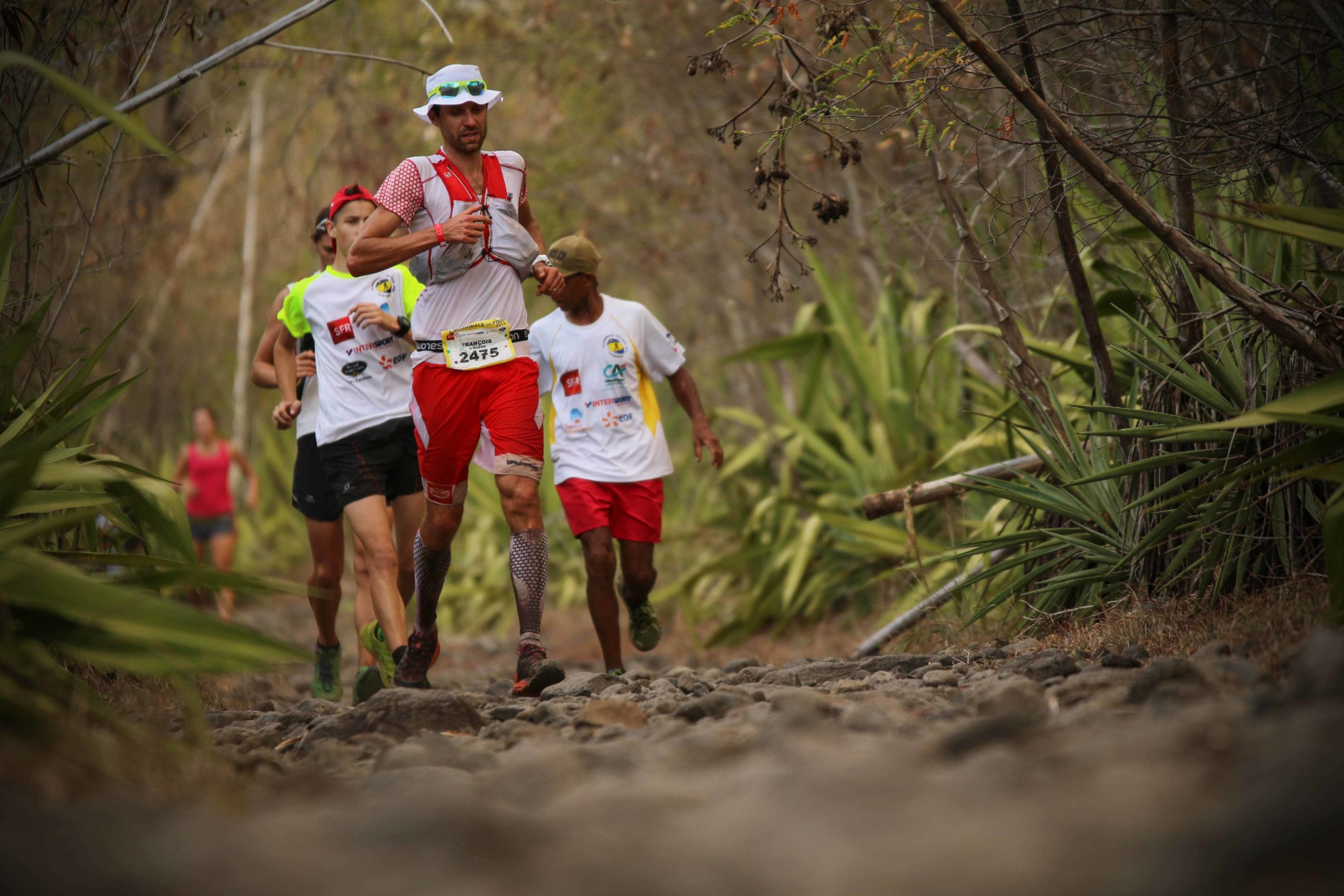 François D’Haene, team Salomon, a dominé la course de bout en bout. Parti dans le groupe de tête il a vite creusé l’écart avec ses poursuivants. A Mare à boue, km 51, il précédait Javier Dominguez-Ledo d’environ 16 mn. A Cilaos, km 67, Gediminas Grinius et Eric Clavery complétaient le podium à près de 34 mn. François D’Haene définitivement installé à la première place a continué à accentuer son avance, la stabilisant à environ 80 mn entre Maïdo Tête dure km 115 et La Possession km 146.