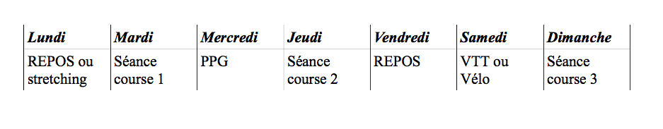 Il est important d’organiser sa semaine d’entraînement en fonction des objectifs et des disponibilités de chacun. Un minimum de trois séances de courses, avec un maximum de cinq séances semble être un volume approprié pour un coureur régulier. A cela, on peut ajouter une séance de PPG et une séance sur vélo afin de varier tout en réduisant les tensions et les chocs sur les articulations. semaine entrainement trail