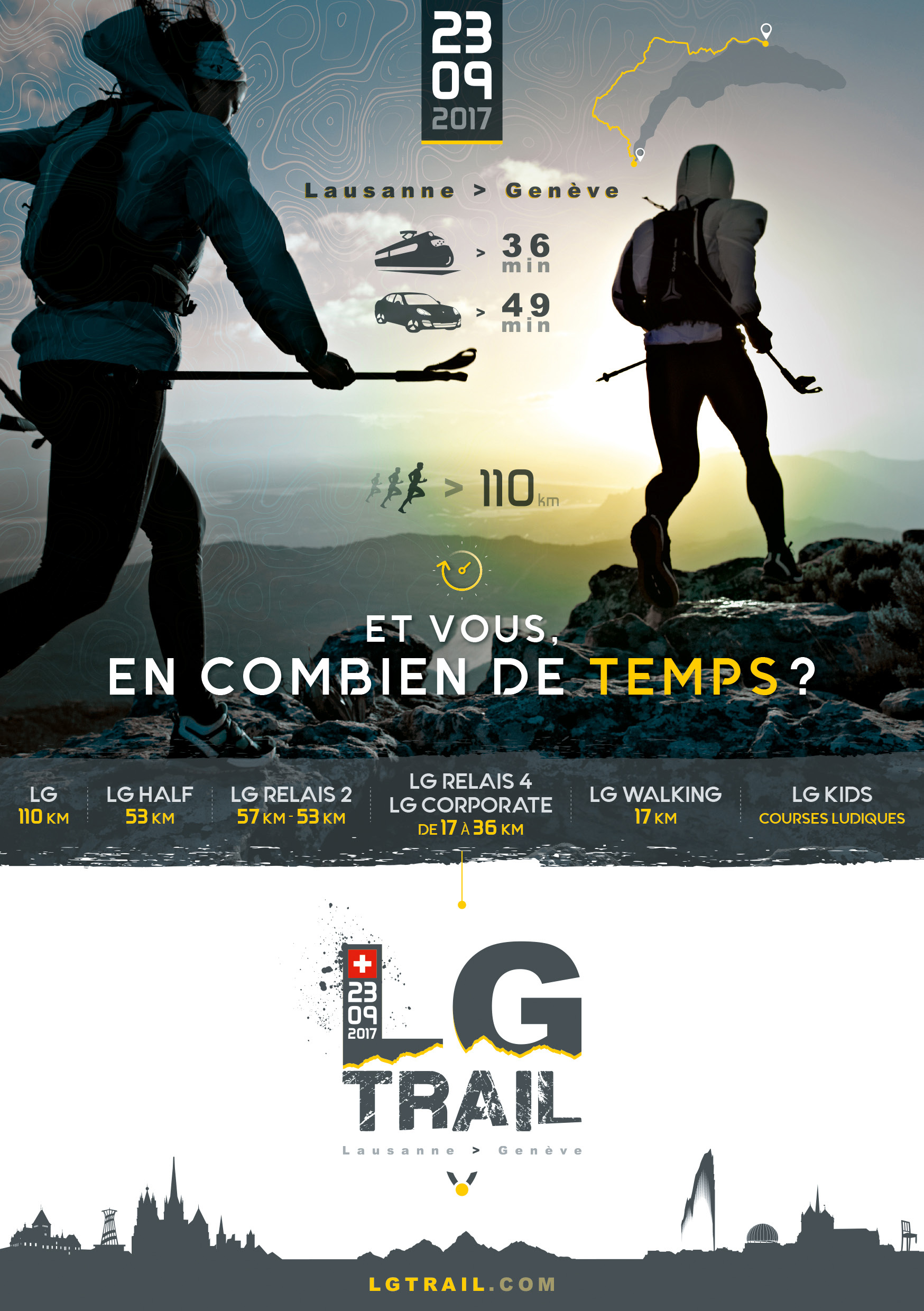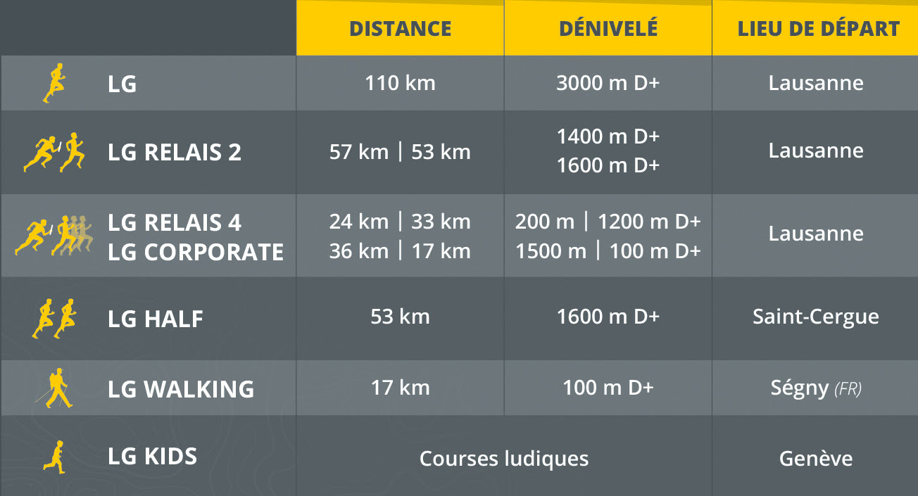 Avec 110 km de parcours variés et 3 000 m de dénivelé positif dans un cadre d’exception, l’association ‘LG Trail’ vous propose ainsi un défi hors-norme. Le départ de la première édition sera donné à Lausanne le samedi 23 septembre 2017 avant l’aube. Le parcours traversera les plus beaux paysages des cantons de Vaud, Genève et du Pays de Gex (France) : les berges du lac Léman, les vignes de La Côte, les crêtes du Jura avec en toile de fond les sommets mythiques des Alpes : l’Eiger, le Cervin, le Mont Blanc… Enfin, Genève accueillera les coureurs pour une arrivée festive au cœur de la ville.