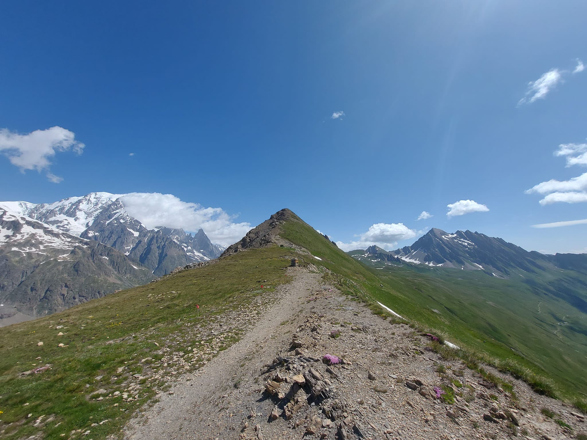 Une fois qu’on est en haut, on avance « tranquille), on profite de la beauté de la crête, avant une dernière bonne grosse côte avant de prendre un balcon qui nous amène du col du Joly. La fatigue aidant, j’avoue ne pas trop avoir regardé en bas, mais je me souviens m’être dit que c’était plutôt technique. Et de nouveau, « comment tu vas faire avec une nuit blanche et demi dans les dents pour ne pas t’éclater ? » ?