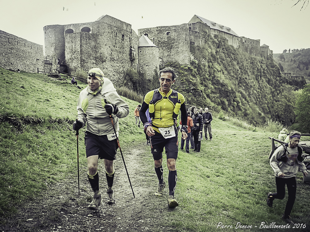Etienne Van Gasse nous présente le tracé du 49 km de la Bouillonnante. « Il n’y a pas beaucoup de temps morts mais des casse-pattes, des relances et portions techniques sur des crêtes schisteuses. Après un départ au cœur du magnifique château de Bouillon, les trailers virevoltent essentiellement en forêt en passant par des lieux quatre étoiles bien nommés : l’ascension du Rocher du Pendu, les crêtes de Frahan et une grimpette nommée « The Wall » pas trop longue, mais plutôt verticale sur un chemin imaginaire. Suivent une vue splendide sur le Tombeau du Géant, la descente vers deux passages à gué si la hauteur de la Semois, affluent de la Meuse, le permet. Ce 49 km se termine par une dernière côte, en deux temps, avec un premier plateau qui offre une vue superbe, suivie d’une ultime montée où des places peuvent se gagner… ou se perdre.  »