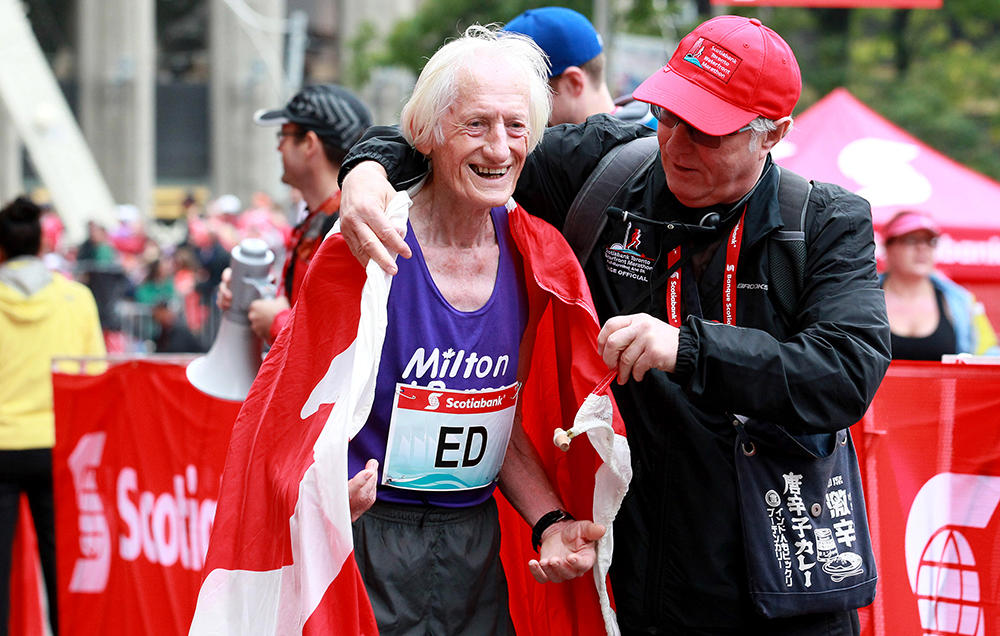L’athlète canadien Ed Whitlock a pulvérisé de plus de 30 minutes le record de marathon de sa catégorie. Un peu déçu, il visait les 3h50. Il a déclaré « Je visais les 3h50, mais cela a commencé à être beaucoup plus difficile pour moi après la mi-course » et «  »J’ai couru trop vite au départ. A chaque fois, je me promets de ne pas le faire, mais ça ne manque jamais », a-t-il lâché, tout sourire. »