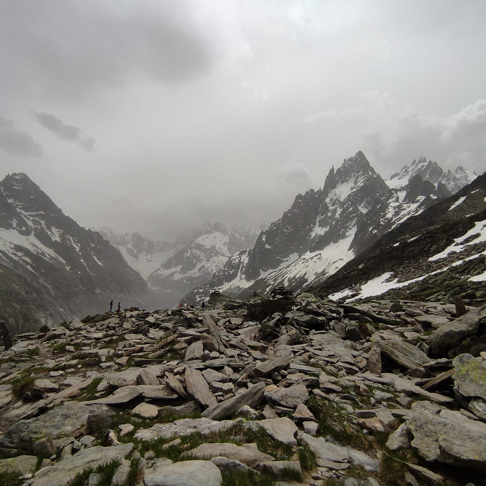 Le premier jour, le temps de faire connaissance avec le groupe, très chouette par ailleurs, nous démarrons de la place du triangle de l’amitié pour monter vers le refuge de Bel Lachat (et quand on monte, je n’arrive pas à m’enlever de la tête ce très mauvais de jeu de mot « bel lachat haut… » et j’ai honte). Cette première montée passe plutôt bien, malgré une météo lourde. On devra regagner Plan praz en redescendant, il y a trop de neige sur le Brévent. Après un petit passage à la Flégère, on va quasiment jusqu’à tête aux vents pour redescendre à Montroc. C’est une première journée qui se termine avec 28km et 2000m de dénivelé positif dans la musette. Je suis alors sur les rotules, la faute à une dernière descente hyper difficile et à des sensations qui ont du mal à venir. Après, c’est normal ; c’est la première sortie en montagne de l’année, et il faut encore que je récupère de mon angine blanche ; le contraire aurait été assez étonnant.