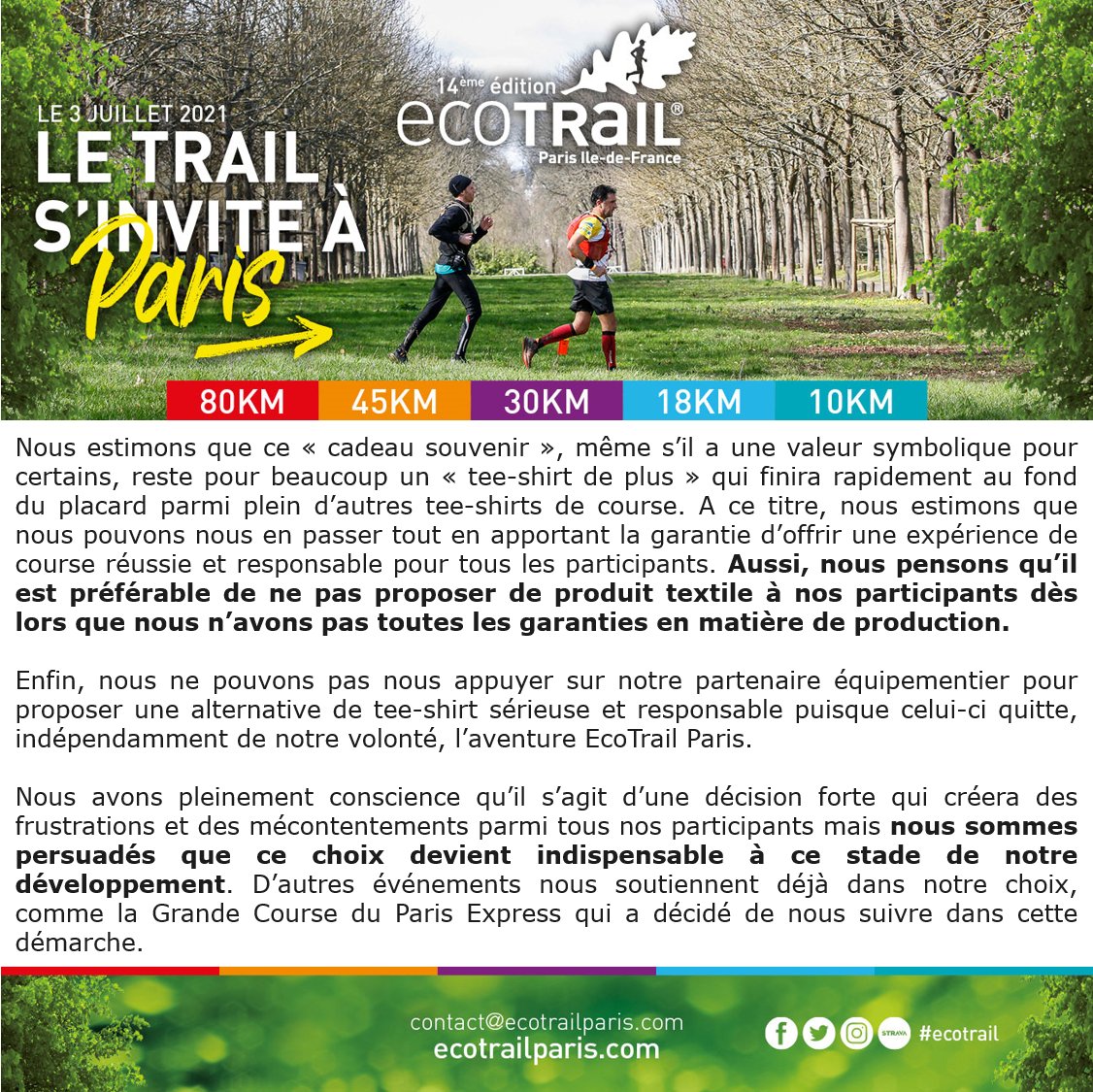 • Quelques mots ce soir pour revenir sur la nouvelle annoncée par l’EcoTrail Paris 2021 (pour son édition de juillet) : pour la première fois, il n’y aura pas de tee-shirt de finisher.