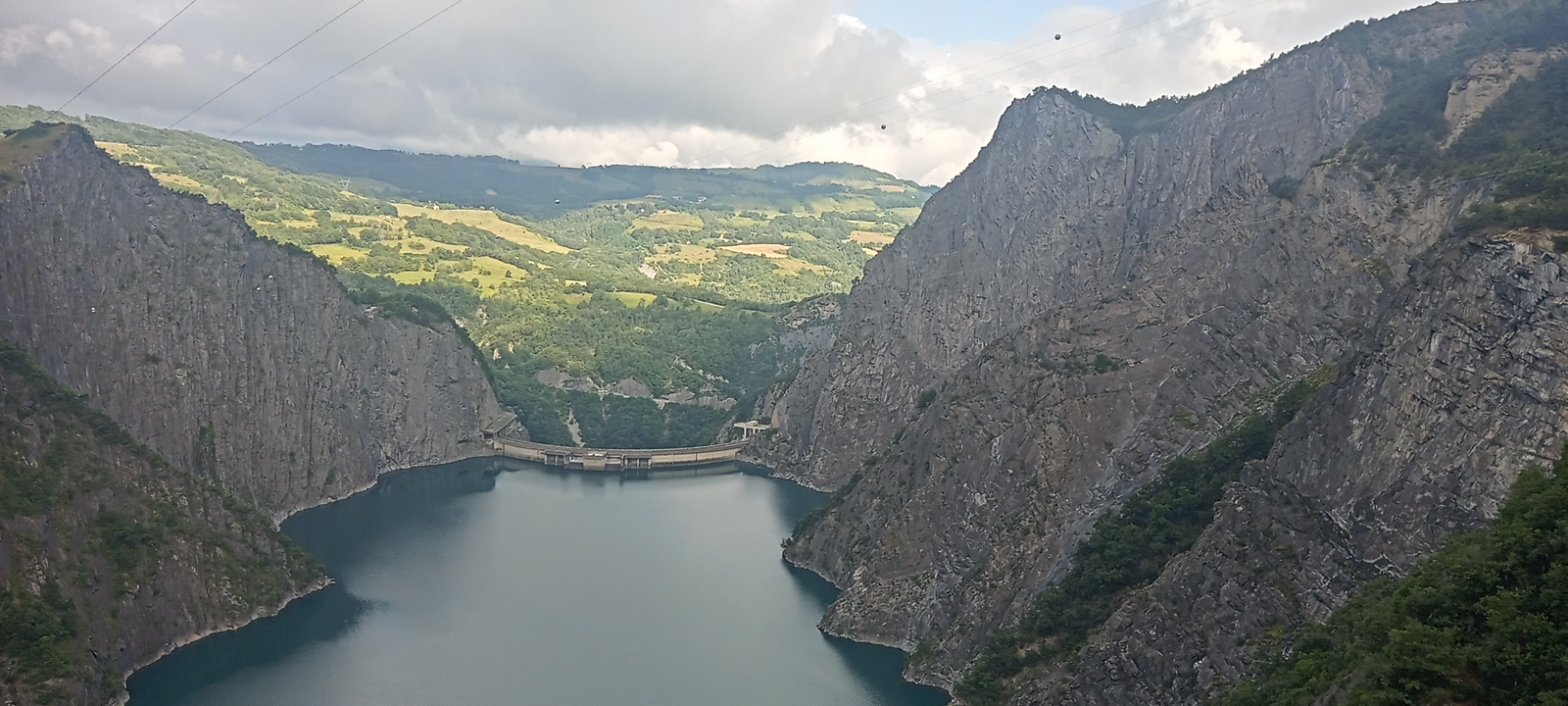 Après 17km, on arrive à la Pierre Percée, premier temps fort de la course. On y a un panorama magnifique. Mais pas le temps de pavoiser ; on redescend pour arriver à la Mine image, qu’on traverse (sur 200 mètres, je crois). Après une petite côte, on arrive au Belvédère, et à une première vue sur le lac et le barrage du Monteynard. Et on en prend plein les yeux. Le pire, c’est que ce n’est que le début.