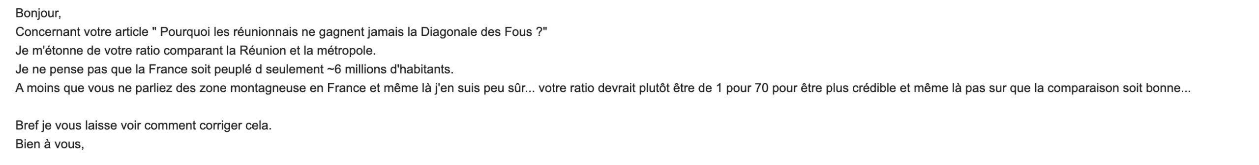 La Réunion est un petit département dont le nombre d’habitants n’excède pas 870.000. Si l’on fait le parallèle avec la France Métropolitaine, cela fait sept fois moins d’habitants. Ce qui veut dire, si l’on fait une transcription basique, que pour 1 vainqueur potentiel de la diagonale qui vienne de la Réunion, on en aura 7 qui viendront de Métropole. Et encore, ici, on ne fait que le ratio par rapport à la France, mais si on le fait par rapport à la Chine, ça doit être absolument effrayant.
