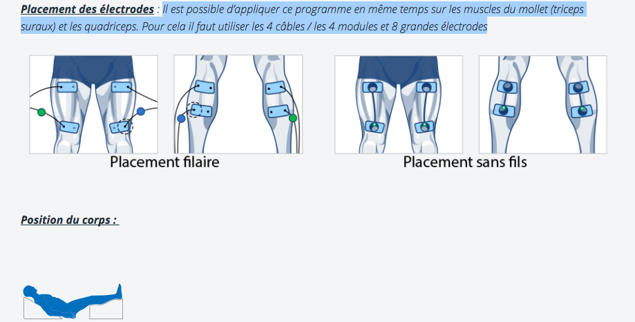 Il est possible d’appliquer ce programme en même temps sur les muscles du mollet (triceps suraux) et les quadriceps. Pour cela il faut utiliser les 4 câbles / les 4 modules et 8 grandes électrodes