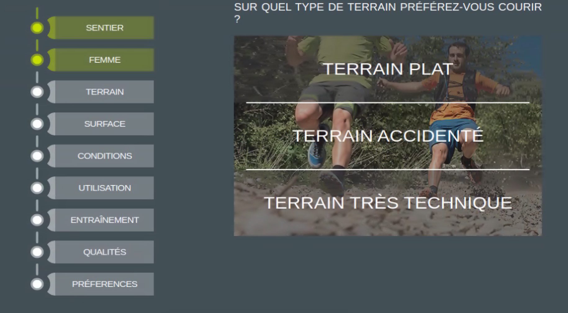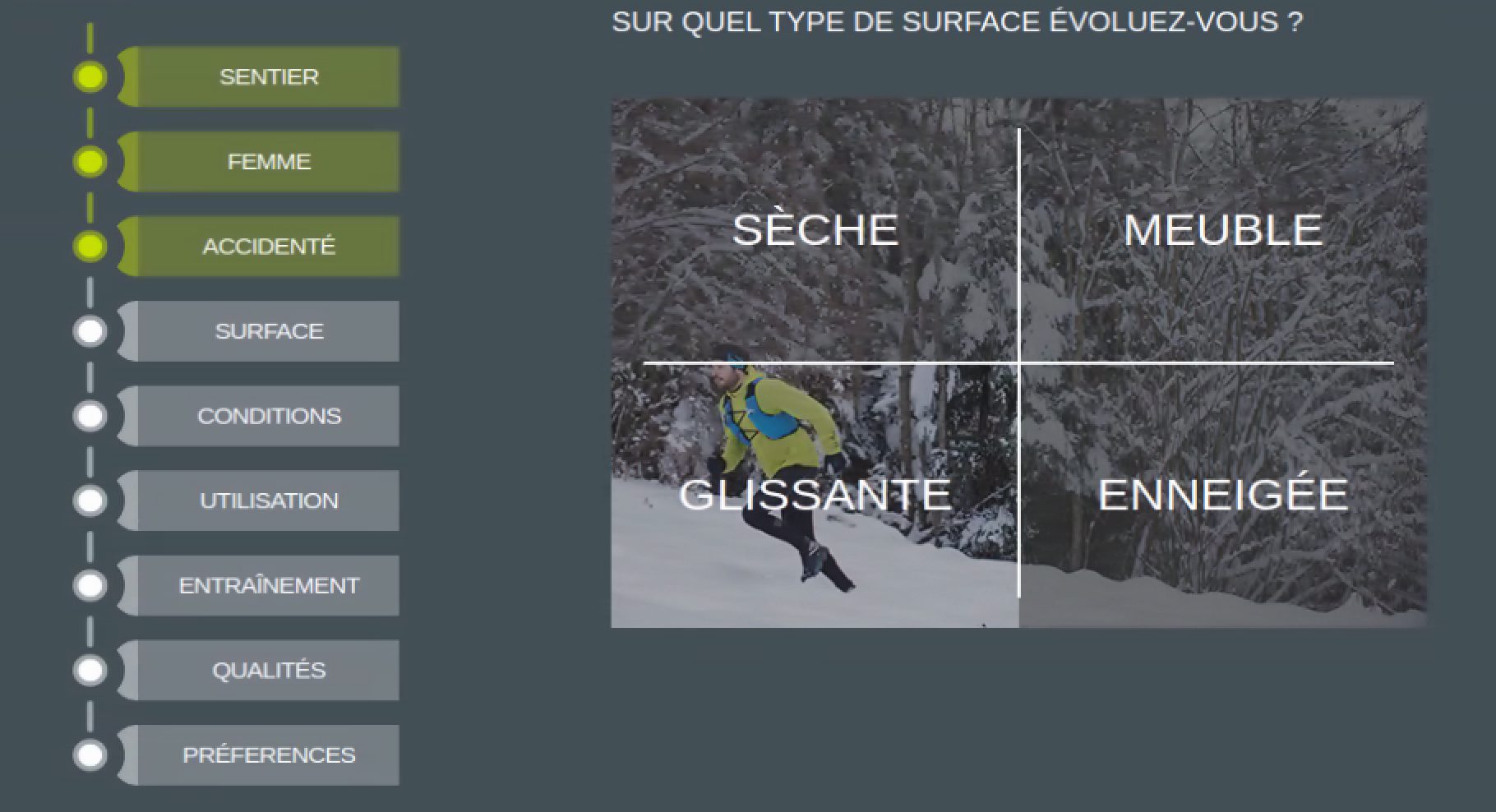 Les étapes du shoe finder, les différents critères de sélection pour aider à choisir vos chaussures de trail Salomon.