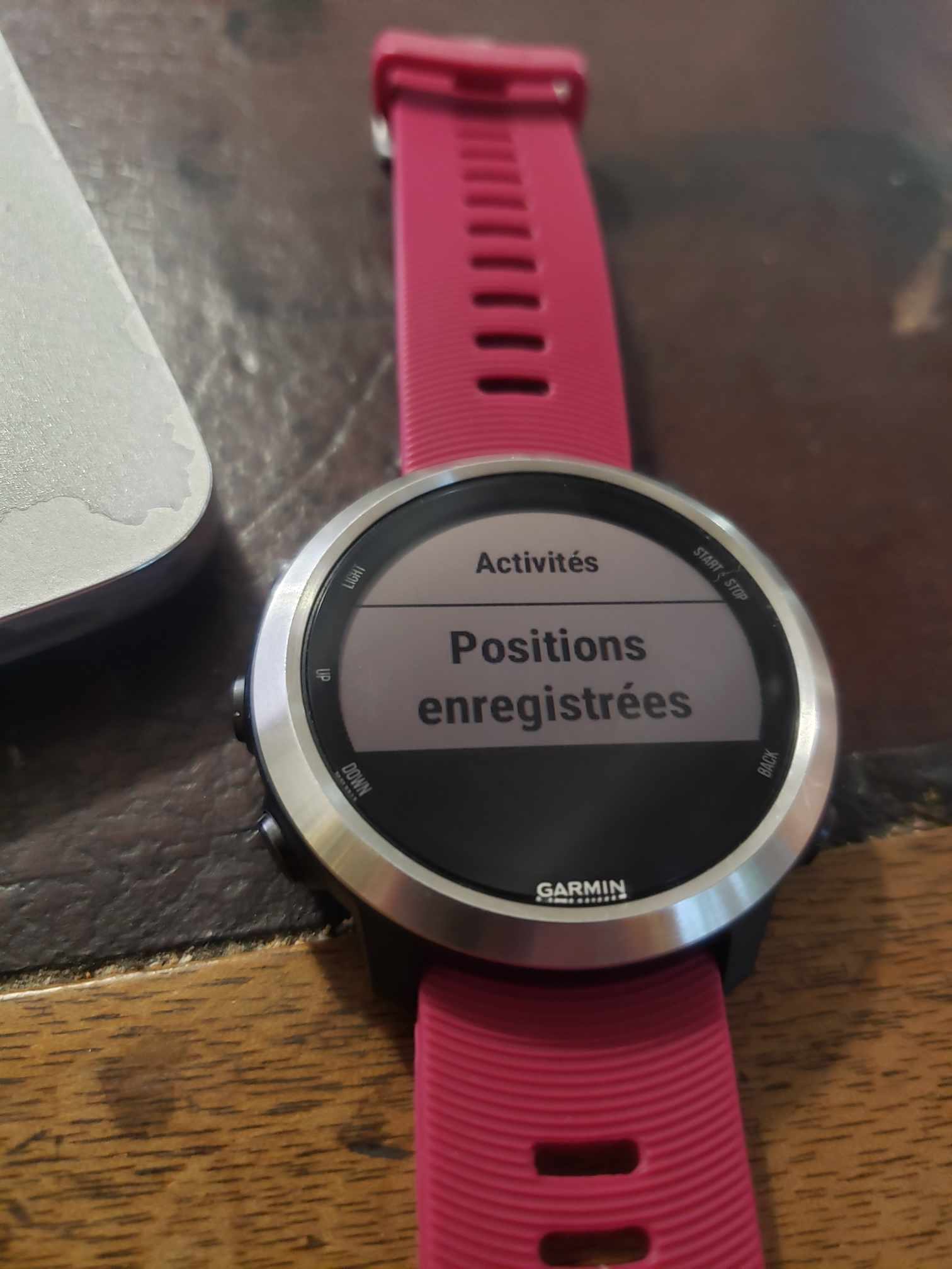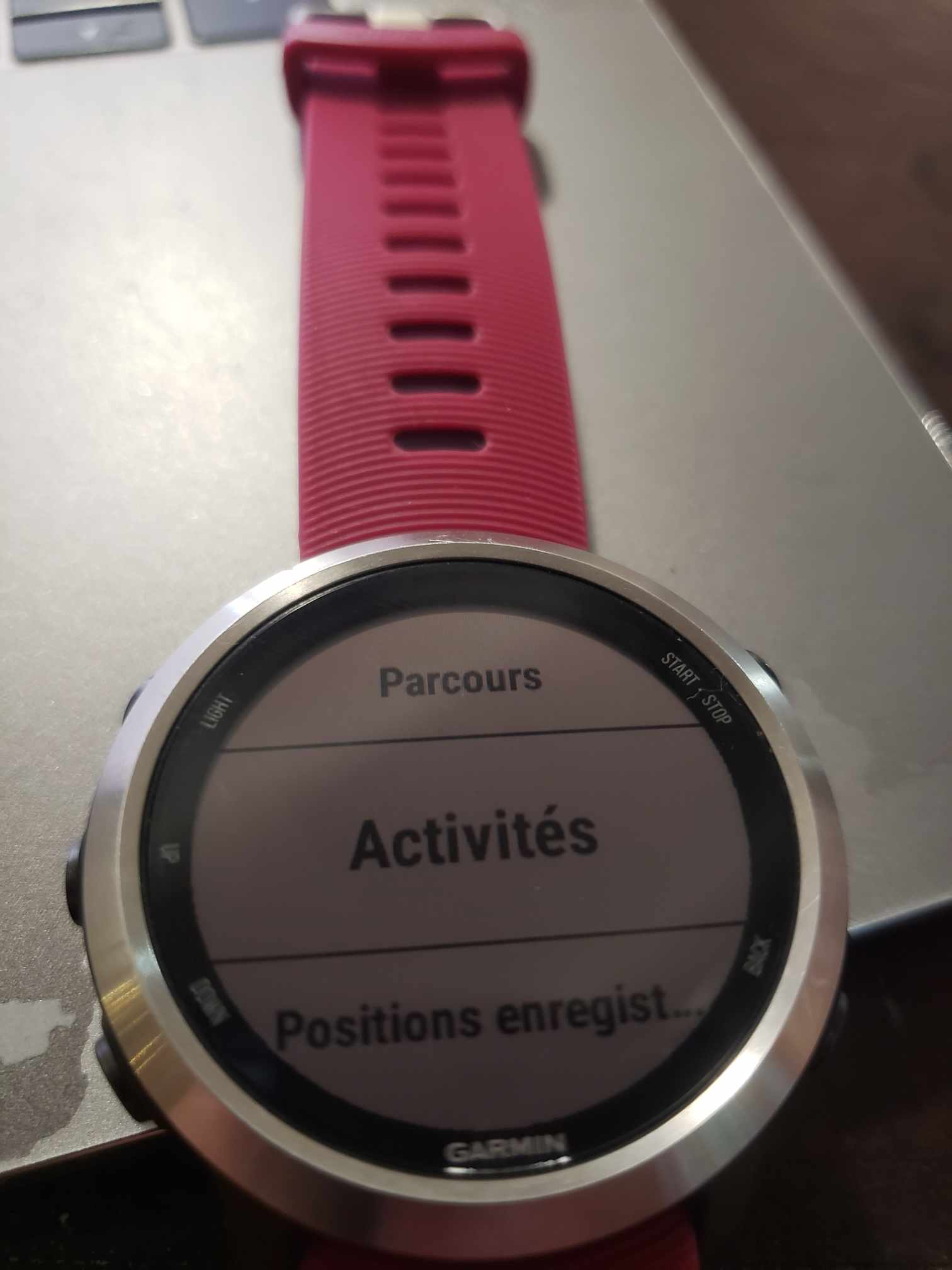 Dès que c’est fait, vous démarrez une activité, mais avant de la lancer, vous appuyez sur « menu » (le bouton du milieu), vous appuyez sur « parcours », et vous cherchez l’itinéraire préalablement enregistré.