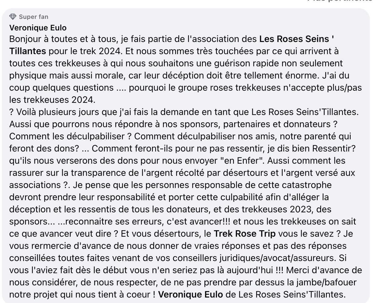 L’association Les Roses Seins ‘ Tillantes, qui envisageait de participer au Trek 2024, exprime sa solidarité envers les trekkeuses touchées et pose des questions cruciales sur l’acceptation des trekkeuses 2024 et la transparence financière. La déception et la colère sont palpables dans leurs interrogations sur la responsabilité des organisateurs et la gestion des dons.