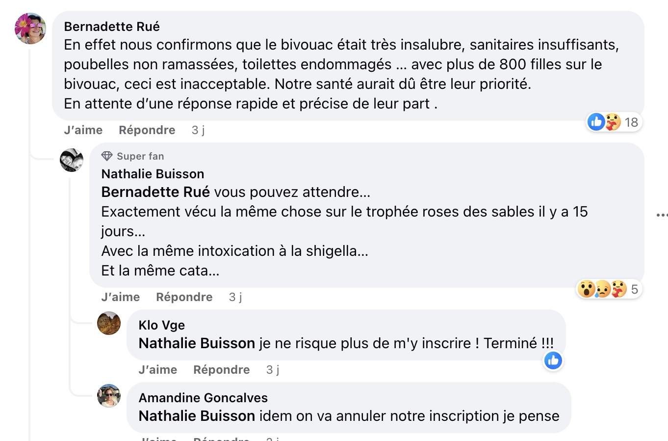 Des centaines de participantes ont partagé des histoires alarmantes, toutes convergentes vers une intoxication à la bactérie Shigella. Les conditions sanitaires du bivouac sont décrites comme insalubres, avec des sanitaires insuffisants, des poubelles non ramassées et des toilettes endommagées. Les trekkeuses ont vécu un calvaire, entre fièvre, courbatures, chute de tension, diarrhée, et vomissements.