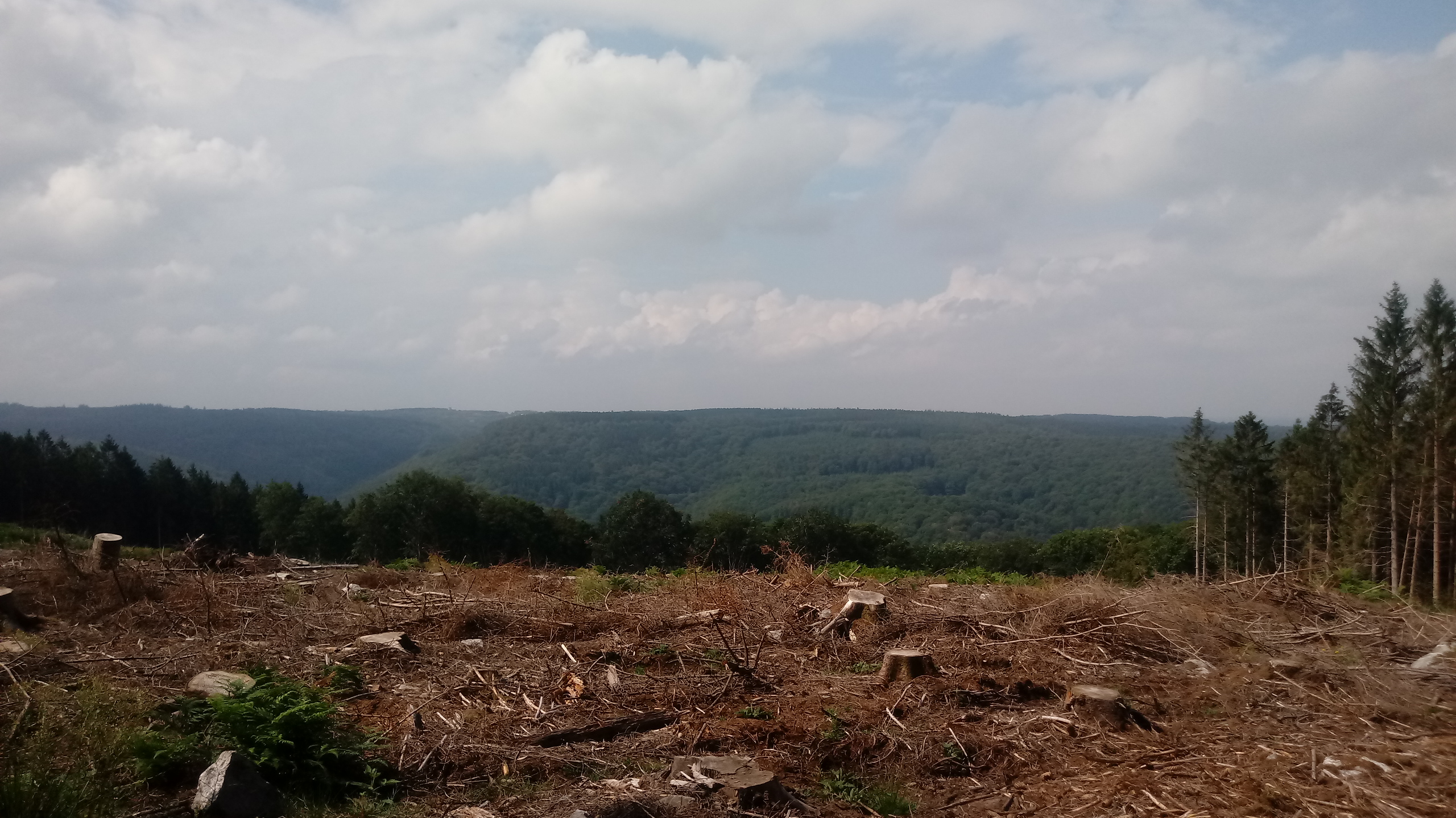 On finit par partir et s’engouffrer dans la forêt, où chaque montée ressemble à un torrent de fortune. Ce coin est très beau, mais je dois bien reconnaître que je suis content de l’avoir fait en reconnaissance quelques semaines auparavant. La pluie laisse place à un grand soleil qui sèche, puis réchauffe. On termine cette portion par une montée bien casse-pattes comme il faut. En arrivant au 62ème km, mon pote s’en va, trois autres arrivent pour le tronçon suivant. Après un café, des sandwichs au fromage, des pommes et des tucs, on démarre pour 18km qui nous mèneront à la mi-course