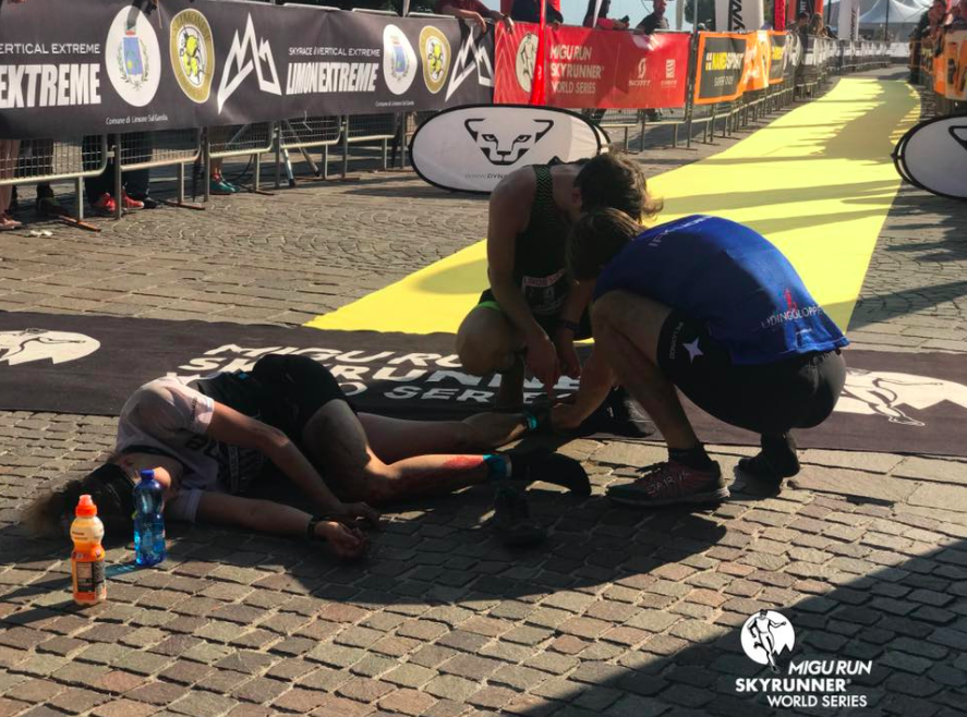 Le correspondant de irunfar a raconté, en anglais, sa fin dramatique : “She literally ran herself to the ground, crossing the finish line and collapsing having cuts on both knees, arms and hands that required medical attention.”