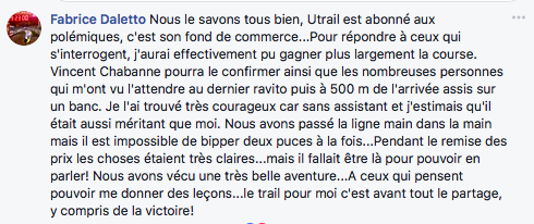 Fabrice d’Aletto remporte les 100 miles Sud de France à seulement une seconde du marseillais Vincent Chabanne. Selon nos confrères de France 3, « tout au long de la course, les deux concurrents ont été au coude à coude ». A seulement 1 seule petite seconde du deuxième sur un 165 km, peut-on réellement parler de victoire ? Même si cela n’enlève rien à son exploit, pourquoi ne sont-ils pas classés ex-aequo ?